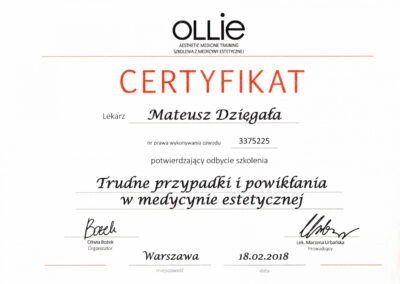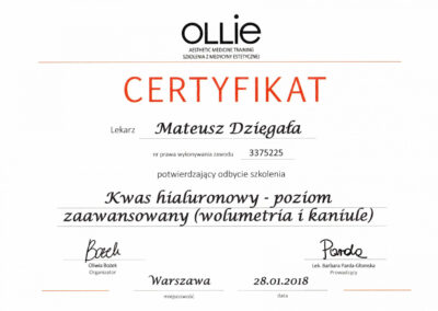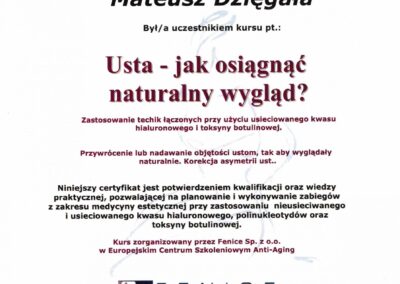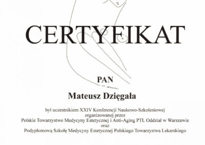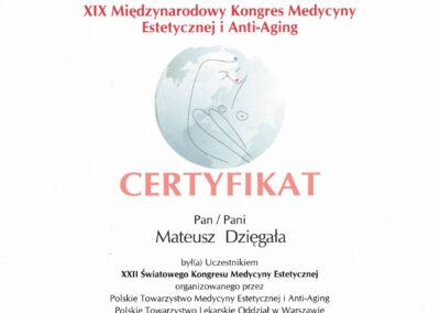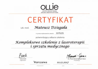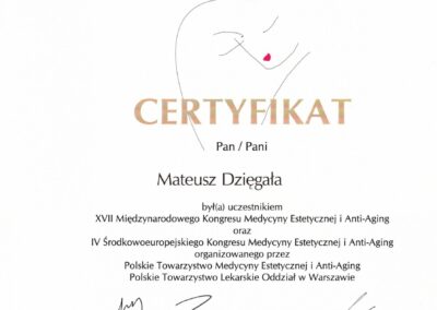 Poniżej możesz zapoznać się z moimi dyplomami i certyfikatami. Dotyczą one między innymi obsługi specjalistycznego sprzętu, wykonywania określonych zabiegów, właściwości preparatów stosowanych w medycynie estetycznej, czy radzenia sobie z powikłaniami.